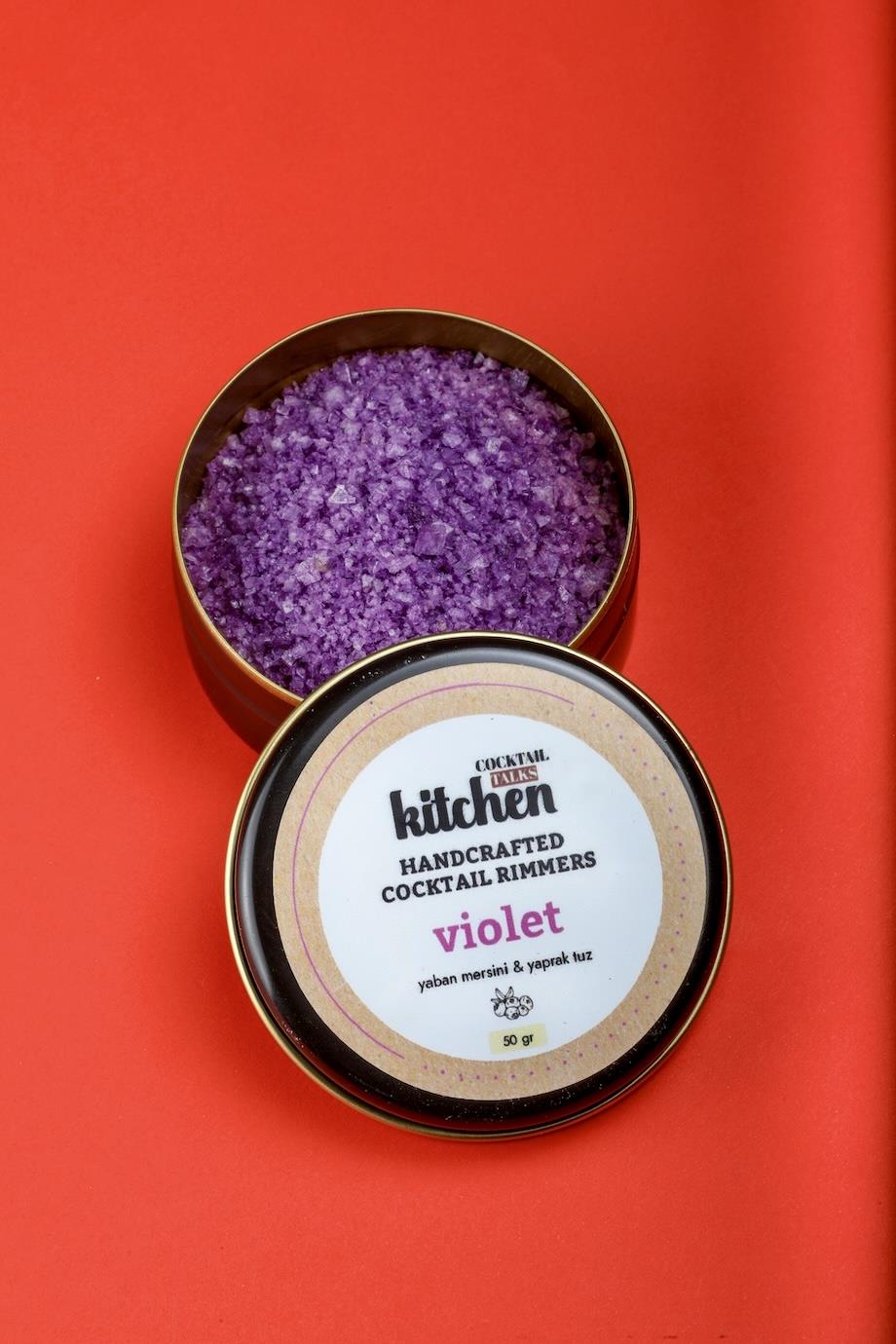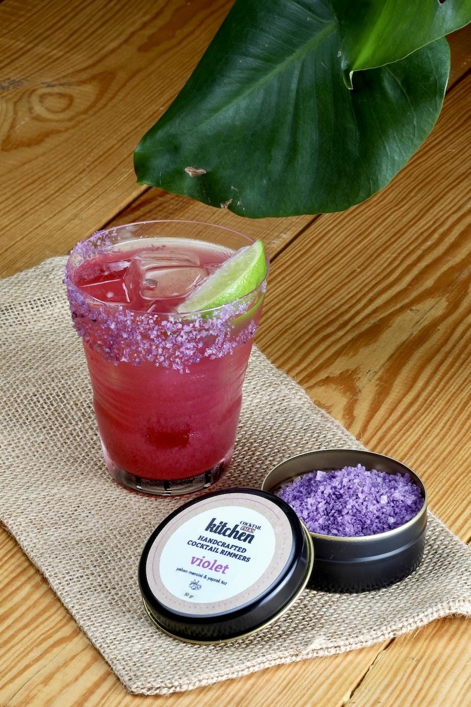 • Violet Rimmer: Yaban mersini ve yaprak tuz bileşimiyle hazırlanan kokteyl tuzu olup kenar kaplamada düzenli tutuş ve canlı bir görünüm sağlar.