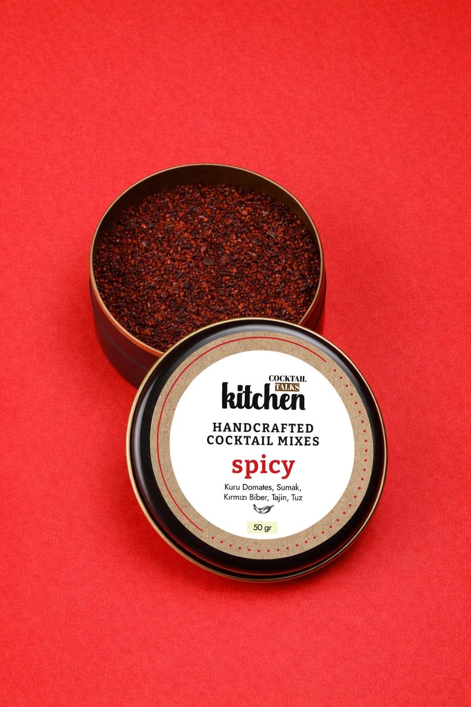 Spicy Rimmer; kuru domates, sumak, kırmızı biber ve Tajin bileşimiyle hazırlanan kokteyl tuzu olup bardak kenarında tutarlı kaplama ve baharatlı bir dokunuş sağlar.